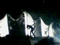 Juste le temps d'abaisser les rideaux noirs qui masquaient la scénographie "circlienne", et c'est vers 21H15 dans une obscurité quasi totale, que les 5 membres du cercle prennent un à un leur place respective sur la scène. A Perfect Circle a décidé d'imposer son univers sans faire de concession et débute ainsi son set par le fantômatique et sarcastique "Vanishing" (il faut oser quand même entamer un concert en répétant une bonne quinzaine de fois ' disappear '). A ma droite, Josh Freese bien installé derrière sa batterie, et devant lui la silhouette imposante de Billy Howerdel à la guitare qui assure quasi seul le chant sur ce premier titre ; à ma gauche, Jeordie White, classieux dans son costume-cravate gris, s'est posté sur le devant de la scène avec sa basse, tandis qu'officie derrière lui, perché sur son podium, le discret James Iha. Au milieu de tout ça, enfermé dans son cube de tissus, Maynard Keenan nous apparaît en ombres chinoises, les jeux de lumières lui donnant des allures de pantin désarticulé. Le décor est planté. Sans se presser et sûr de lui, le groupe enchaîne avec "Pet" et son riff entêtant qui accroît la tension d'un cran, tant musicalement que visuellement, puisqu' à ce moment tombent enfin les quatre rideaux qui encerclaient M.Keenan. A Perfect Circle est venu avec l'artillerie lourde et le son qui va avec, et le prouve sur les excellents titres de son premier LP, "The Hollow" (qui n'en finit plus de m'apparaître comme particulièrement sensuel, allez savoir pourquoi) et "Magdalena". Après le classique "Weak and Powerless", on se délecte sans retenue de la poésie d'un "Orestes" où les voix de Maynard, B.Howerdel et J.White s'entremêlent superbement. Pourtant, tout cela reste très carré, très (trop?) propre, rien ne dépasse et l'on sent que la machine est (déjà) bien huilée (même si J.Iha et J.White s'autoriseront deux incartades solos au cours de la soirée). Les interprétations des morceaux demeurent excessivement fidèles aux versions albums, ce qui est d'autant plus frustrant que le talent des cinq hommes n'est plus à prouver et que l'on aimerait les voir s'exprimer un peu plus librement. D'un autre côté, on ne résiste pas au furieux "Thinking of You" ainsi qu'au très épique "The Package", où Josh Freese matraque ses fûts à tout rompre et impressionne par son jeu puissant, lourd et appliqué à la fois. Un peu plus loin, le combo nous sert une jolie version revisitée de "The Nurse Who Loved Me" nettement plus heavy et plus étirée. Le set se termine sur un tryptique classique, réussi et enjoué ("The Outsider", "The Noose" qui bénéficie d'une intro remaniée, et l'inévitable "Judith"), Maynard prenant la peine de remercier son auditoire et de lui donner rendez-vous pour le début de l'été (chut, personne n'a encore dit les Eurockéennes !).