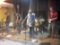 Acetate Zero aime jouer fort. Cependant, les rapprocher d'un certain trouage d'oreilles cher à Mogwai serait un peu hâtif. Le volume sonore diminue sur les parties les plus calmes, laissant des respirations souvent décharnées mettre en relief les instants de véritable cataclysme. Dès la première charge, pour le moins brutale, les petits jeunes du coin qui tiennent la buvette sont médusés. Je leur adresse un sourire mi-moqueur, mi sincèrement-désolé-pour-vous, en leur faisant ensuite comprendre rapidement que je le suis tout autant, médusé! Sur scène les musiciens s'accrochent à leur guitare, libérant de leurs doigts tendus des hurlements, vomissant des larsens que je crois assez contrôlés (quoi que!), sur fond de mélodies terriblement désemparées ou parfois élégiaques. Se démenant dans cette tempête bien plus grande qu'eux, ces cinq là semblent accrochés à leurs instruments comme à une bouée de sauvetage, nous tournant souvent le dos, mais n'hésitant pas à sortir entre deux morceaux une petite connerie au micro. Le groupe s'échange beaucoup les instruments d'un morceau à un autre, la chanteuse passe à la batterie, celui qui tenait la guitare sort une trompette, le batteur lui pique sa guitare, difficile à suivre... Pas de démonstration technique ici, la musique correspond à un besoin viscéral, c'est un cri lancé vers le ciel, pour dire que vivre fait souvent mal, mais que rien ne vaut que d'être encore vivant. Les impressionnantes déflagrations sonores sont entrecoupées de passages franchement pop où les voix se succèdent, toujours de petites voix timides et un peu maladroites, à l'image de la chanteuse qui se cache derrière sa mèche de cheveux, délivrant une sorte de force vulnérable.