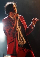 Quand ils ont déboulé sur scène, une demi-heure après le très beau et très émouvant concert de The National, il m'a fallu un temps d'adaptation. Première réaction: c'est un sketch des Inconnus ? Le costard rouge et la mèche sur le côté d'Eddie Argos plaident pour cette hypothèse. J'ai beau avoir écouté avec jubilation leurs très efficaces deux premiers albums, je ne peux m'empêcher de détester ces caricatures de rockers: le gratteux blondinet qui saute partout, tout droit sorti d'une groupe de garage suédois; l'autre gratteux, pastiche de Brian May; la bassiste, adepte du revival grunge à la L7 (pas L5, hein ?); et les interminables tirades en anglais du chanteur, quelque part entre Andy Kauffmann et Thierry Ardisson.