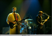 Mendelson arrive finalement assez tard déjà dans la soirée, ce qui forcément ne joue pas en leur faveur. Quoi qu'il en soit, ils sont bien présents et fiers de nous offrir ici les titres de leur dernier album. Mendelson n'a pas froid aux yeux, ils maîtrisent le terrain souvent glissant de la scène, et ne reculent devant aucune plaisanterie, même si elle n'est pas drôle ! Accompagné par Petit Vodo derrière la batterie, l' imposant leader de Mendelson, trapé d'une longue tunique d' Afrique du Nord, jette à son auditoire des textes vifs et cinglants, totalement bruts, parfois amers, mais avant tout emplis d'une réalité crue et immédiate. Bien entendu, l'humour habituel du groupe joue sur des effets de contraste réussis et intelligents ; de cette façon, Mendelson s'approprie littéralement le public au fur et à mesure, avec beaucoup d'intelligence. Les nouveaux titres passent le cap du live avec brio, et l'on est conquis par cette prestation décalée et savoureuse. Pascal Bouaziz, qui ne lâche jamais sa frénétique guitare, nous soumet même le choix des morceaux, se positionnant ainsi en marge des barrières trop rigides du rock, qui voudrait parfois que tout soit calculé au millimètre près. Mendelson n'en a que faire, et c'est bien là tout leur talent.