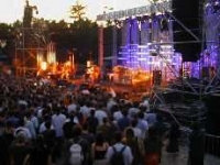 Petit à petit, derrière le fouillis vert des arbres, le soleil tombait (son coucher offrit un projecteur idéal et incongrus : sorte de lumière couleur orange-grenadine) et les étoiles s'immiscèrent dans le décors. La nuit s'installa, la chaleur resta, les sourires béas aussi, et tandis que les spots prirent l'ascendant sur la vue du concert, les chansons se drapèrent d'un climat maniéré, à la fois chaud ("Karma Police" repris en ch?ur) et froid ("Talk Show Host", tout simplement trippant). Aucune fausse note de la part des musiciens, en phase et visiblement heureux d'être là, Thom Yorke passant le plus clair de son temps à s'accrocher à son micro, petit oisillon à peine sorti de l'?uf, s'en écartant que pour gesticuler comme un pantin détraqué à la limite du pétage de plomb. Tout simplement envoûtant.