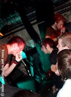 Place aux Liars après un bon gros changement de plateau, cette fois je connais les chansons car en novembre dernier, à la Boule Noire, la découverte live du nouvel album nous avait désarçonnés. Le batteur en jupe brillante et slip old-school marqué de dollars commence sur un rythme décharné, le trio s'emballe... Le chanteur est un géant, un peu de basse, un peu de guitare, beaucoup d'escalade (!!) mais surtout le mec s'acharne sur pédales et effets et entraîne la zic dans une spirale de folie. Les quelques mots français de son vocabulaire (saucisson, droite , gauche, etc) se distordent sous les effets et les compos "électro-noisy" (dur de définir leur délire) défilent alternant moments plus calmes et phases à la rythmique furieuse. Charmé par un public qui a du répondant et connaît les paroles, le chanteur fait subir le martyr à son micro; quant au guitariste il bidouille de son côté claviers et percussions. Seul un final bruitiste peu inspiré ira voiler mon sentiment d'avoir rencontré le troisième type ! Auparavant le groupe aura enchaîné sans attendre de rappel et en plaisantant sur les loges qui déchiraient leur mère (traduction approximative...), le chanteur ira même jusqu'à nous expliquer que c'était maintenant le "encore" !! Comme la dernière fois, je trouve leur set un peu court, une heure tout compris... mouais... Néanmoins, comme pour Thursday récemment, saluons aussi un groupe bénéficiant d'un éclairage "tendance" qui prend le risque d'emmener un groupe plus "underground" en tour avec lui, d'autant plus que la musique des 2 groupes n'a rien à voir.