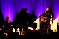 J'y vais. J'y vais pas. Allez je me rends devant l'Olympia et l'écriteau du guichet choisira pour moi. Il reste des places. Ok c'est parti même si j'ai un peu peur que la soirée soit cheesy et comme le Québec n'est pas une région à fromages ça doit pas être joli joli. Mon doute persiste durant la première partie. Un certain Doveman (quel nom !) avec des complaintes neurasthéniques à peine sorties du gosier. Et puis voilà Glen Hansard et Markéta Irglová qui entament sans broncher "Fall From The Sky" à genoux face à leur boite à rythmes. Comme des enfants, avec leur grande complicité. Ils se présentent enfin : "Bonjour nous sommes la saison de la Houle". Dès lors des musiciens se glissent devant les vagues illuminées qui décorent la scène. Je comprends un peu plus tard ? et d'ailleurs Hansard nous l'avoue par la suite ? The Swell Season est le projet qui regroupe ce qu'il aime faire avec sa moitié depuis ces dernières années et ses partenaires de The Frames avec qui il tourne depuis 20 ans. Sous cet angle là les compositions du rouquin oscillent entre balades soyeuses et inflexions rugueuses, avec pour ma part une préférence pour la seconde facette. D'ailleurs si la Tchèque ne venait pas par moment ajouter son grain de sel (elle est quand même ovationné pour "If You Want Me") on croirait avoir affaire à The Frames dans toute leur superbe. Mais comme toujours c'est Glen qui tient le groupe d'une voix séraphique lorsqu'il ressort des ballades de Once ou plus récemment "In These Arms" ou "Back Broke" plus basse mais absolument magnifique, ou comme je l'ai dit d'une voix de fer lorsqu'il tique et s'embrase subitement. Mentions spéciales à "Leave" toujours aussi sensationnelle, bouleversante d'authenticité et de tripes même avec quelques accords manqués. Et encore plus intense et dans une pelote de nerfs dense "Say It To Me Now" interprété en acoustique en solo qui force le respect. Si bien que je pense que ce serait la dernière chanson couverte par l'ovation du public. Je me trompe puisqu'ils jouent encore 1h30. Idem lorsque "When Your Minds Made Up" semble clotûrer un set parfait dans une détresse et une colère contagieuse, alors que la suite du concert reprend son cours après cette houle d'émotions. The Swell Season maîtrise les élements et canalise les montées d'émotions sans mater les émotions pour autant. Ils choissent d'ailleurs leurs reprises avec beaucoup de goût et de cohérence notamment "Famous Blue Raincoat" précédée par "Court Of New Town" qui ne pouvait pas mieux être vécu que par le violoniste irlandais Colm MacConlomaire. Et la cerise "You Ain't Goin' Nowher" avec s'il vous plait Monsieur Robbie Robertson on stage. Bref une soirée chaleureuse et généreuse à souhait et... pas le moins cheesy.