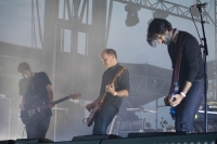 À peine le temps de souffler qu'il faut déjà se diriger vers la grande scène où le concert d'Explosions in the Sky va débuter. Bien que n'étant pas très fan de rock instrumental, j'ai un faible pour ces américains qui savent faire monter la sauce à partir d'ingrédients assez classiques : trois guitares alternant arpèges délicats et blitzkrieg shoegaze, et une rythmique basse-batterie puissante malgré la lenteur des tempos. Il me faut un peu de temps pour rentrer vraiment dedans: la succession des concerts s'ajoute aux onze heures de bus Macron de la nuit précédente, qui ont pallié l'annulation de mon IDTGV pour cause de grève. Mais dès qu'arrivent les vieux morceaux, plus nuancés, mieux construits, je change de dimension, transporté par cette drogue puissante que peut être la musique. Surtout combinée à la fatigue.